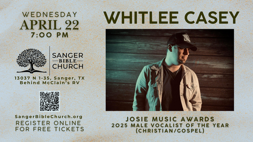 We are so excited that award-winning recording artist Whitlee Casey has made space in his national Let There Be Peace tour to come to Sanger Bible Church!
